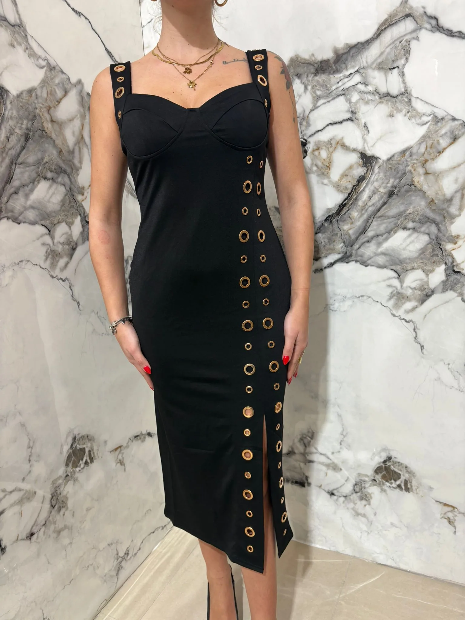 Abito nero con borchie di colore oro